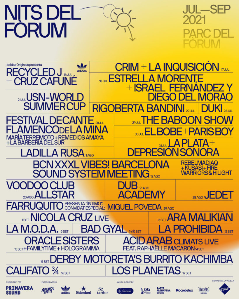 Ha llegado el momento de que Nits del Fòrum vuelva a llenar de música el verano de Barcelona por segundo año consecutivo. El ciclo de conciertos promovido por Primavera Sound junto a otras promotoras de la ciudad inaugura su programación este fin de semana con el doble cartel que juntará a Recycled J y Cruz Cafuné de la mano de adidas Originals el viernes 16 de julio, la descarga punk de Crim y La Inquisición del sábado 17 y la cita flamenca con Estrella Morente e Israel Fernández del domingo 18.
