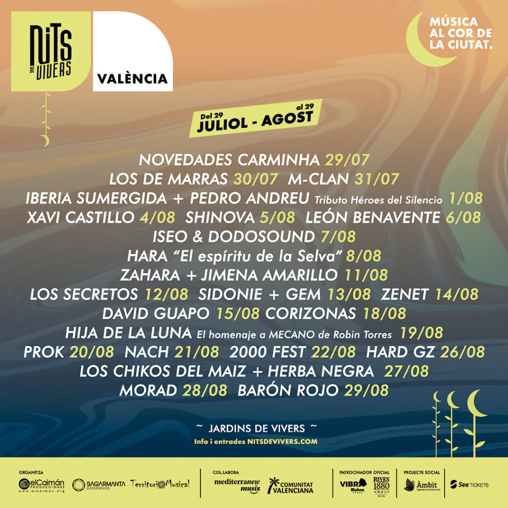 Se debe recordar que el ciclo Nits de Vivers servirá para enriquecer la oferta cultural del verano tanto para las personas que permanecen en la ciudad de València y alrededores como para los visitantes. Los conciertos se realizarán desde el jueves 29 de julio hasta el domingo 29 de agosto. Durante cinco semanas, los asistentes podrán disfrutar con propuestas de pop, rock, rap, música urbana y una noche dedicada a la música electrónica de baile de la primera década de los 2000. Además, habrá un espectáculo musical para el público familiar y dos veladas humorísticas.