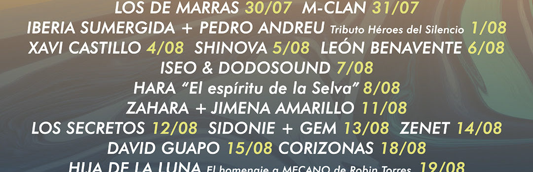 El ciclo comenzará el jueves 29 de julio con la presencia de Novedades Carminha, formación de pop-rock bailable. Un día después será el turno de los valencianos Los de Marras, que presentarán su reciente disco Peligro Esperanza. El sábado 31 de julio, M-Clan repasará su larga trayectoria en un concierto muy especial. El primer día de agosto está reservado para Iberia Sumergida, banda tributo a Héroes del Silencio que contará con Pedro Andreu, batería original de los zaragozanos.