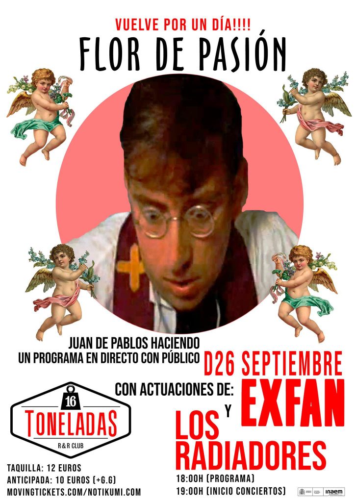 ¿Quieres asistir a un programa de Flor de Pasión de Juan de Pablos? El domingo de 26 septiembre, en horario vespertino, el legendario locutor de Radio 3 hace su programa sobre el escenario del 16 Toneladas de Valencia. Después, podrás ver en directo a ExFan, el dúo formado por Pat Escoin (Los Romeos, Lula) y Tommy Ramos (Depressing Claim, Los Reactivos) y como artistas invitados, Los Radiadores.