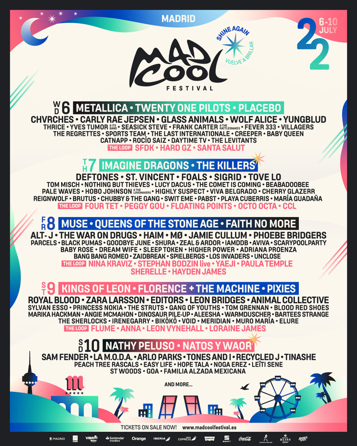 Florence + The Machine, Queens of the Stone Age, Nathy Peluso, Natos y Waor, Chvrches, Glass Animals, Haim, Animal Collective, Flume, Sam Fender, La M.O.D.A., Arlo Parks, Tones & I, Tinashe, Four Tet, Yves Tumor, Villagers, Zeal & Andor, Recycled J, Peach Tree Rascals, Easy Life, Hope Tala, The Regrettes, Baby Queen, Adriana Proenza, The Sherlocks, Muro María, Leiti Sene, St Woods, Goa, Familia Alzada Mexicana. Estas 32 nuevas bandas se suman a las 104 ya anunciadas el pasado mes de junio, Mad Cool Festival completa la casi totalidad de su cartel.