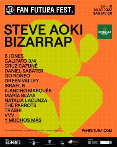 En lo más alto del primer avance de cartel de FAN FUTURA FEST. 2022 nos encontramos con un top 10 DJ mundial como es Steve Aoki. El gran samurai de la mejor EDM planetaria. Al que se une, uno de los artistas más vibrantes y de moda del momento: Bizarrap. El archifamoso DJ y productor argentino -de EDM, trap, hip-hop y reguetón- está considerado como el artista de habla hispana más importante de dichos géneros. Desde Ibiza a San Javier, llegará B Jones con su sesión techno y house, la primera artista española en subirse al escenario principal de Tomorrowland.