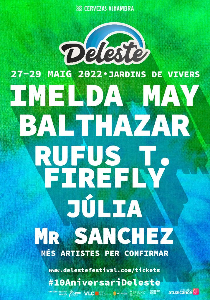 El Festival Deleste de València celebrará su décimo aniversario del 27 al 29 de mayo con un cartel musical que estará encabezado por las bandas Imelda May, Balthazar, Rufus T. Firefly, Júlia y Mr Sanchez. Se trata de las primeras confirmaciones internacionales, estatales y locales de una programación musical que ocupará los emblemáticos Jardines de Viveros para expandirse a otros espacios de la ciudad y poder ofrecer al público una experiencia integral con un festival que da un paso adelante en su propuesta cultural para combinar música y otras actividades culturales y de ocio.