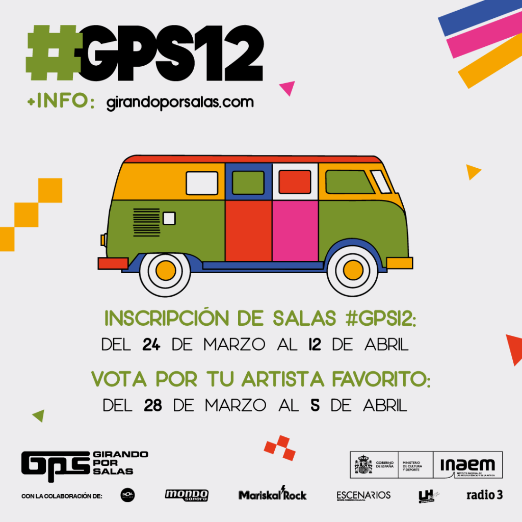Por su parte, las salas que quieran optar a las ayudas por acoger artistas #GPS12 podrán inscribirse desde las 11:00h del jueves 24 de marzo, hasta las 18:00h del martes 12 de abril (horario peninsular). Las salas interesadas (privadas o de gestión privada), pueden consultar las bases en la web de Girando Por Salas. Este es el enlace directo a las bases de salas.