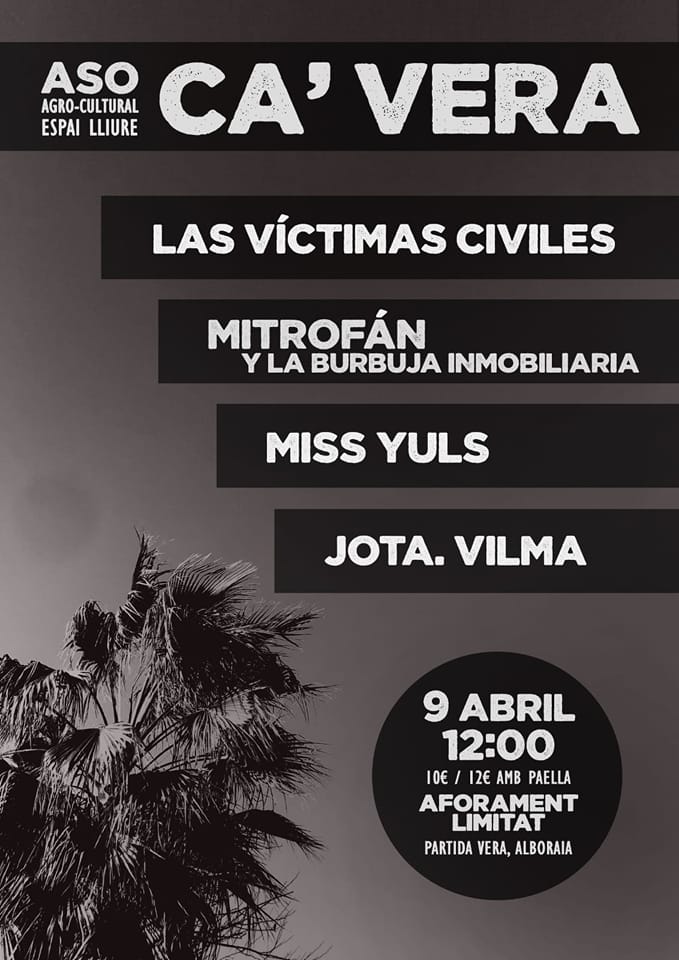 Las entradas están a 10€ (o 12€ incluyendo un plato de paella), y se podrá disfrutar de las actuaciones de bandas, artistas y dj’s. El cartel está compuesto por Las Víctimas Civiles, Mitrofán y la Burbuja Inmobiliaria, Miss Yuls y Jota. Vilma.
