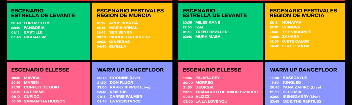 La inauguración el primer día correrá a cargo de Arde Bogotá en el Escenario Festivales Región de Murcia y contará con bandas como Rigoberta Bandini, The Vaccines o Zahara y el segundo día con Nunatak mientras que el Escenario Estrella de Levante tendrá cuatro claros protagonistas cada día: Lori Meyers, Fangoria, Bastille y Digitalism el viernes y Miles Kane, Izal, Trentemøller y Mura Masa el sábado.