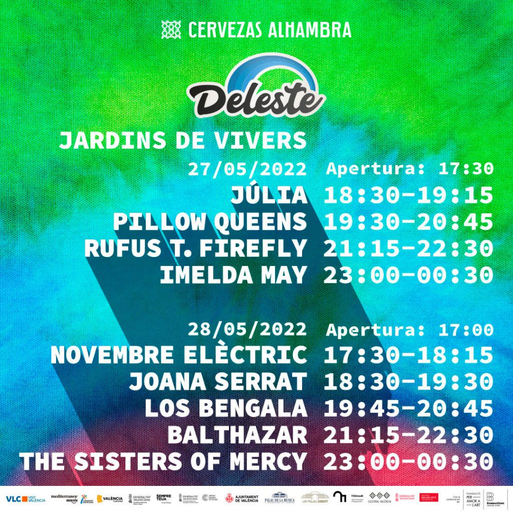El festival Deleste ya calienta motores para la edición que servirá para celebrar su décimo aniversario. De esta forma, la organización ha dado a conocer los horarios de los conciertos que se celebrarán el viernes 27 y el sábado 28 de mayo en los Jardines de Viveros de ValÈncia. Cabe recordar que, durante esas jornadas, el escenario del festival acogerá las propuestas de Imelda May, The Sisters of Mercy, Rufus T. Firefly y Balthazar, entre otras.