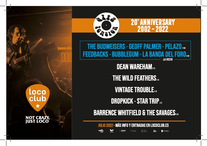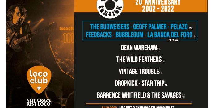 Para celebrar tan magno acontecimiento, Alta Tensión ha programado los conciertos de The Budweisers, Geoff Palmer y Pelazo (viernes 8), y Feedbacks, Bubblegum y La Banda del Foro (sábado 9) como fiesta de aniversario, contando el resto del mes con las actuaciones de Dean Wareham, The Wild Feathers, Vintage Trouble, Dropkick, Star Trip y Barrence Whitfield & The Savages. ¡Por otros 20 años más!