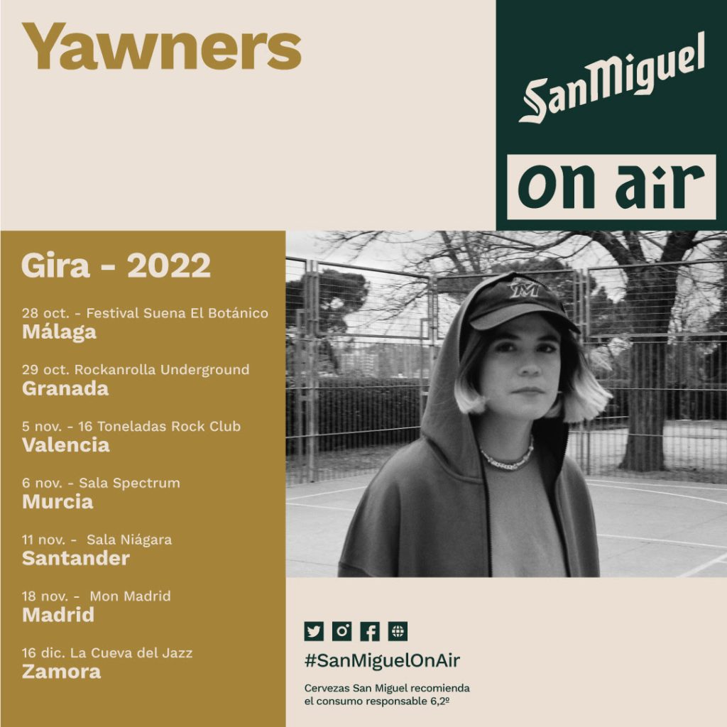 San Miguel On Air continúa su circuito por las salas de toda España con la gira de Yawners, que comenzará en Málaga el próximo 28 de octubre. Esta acción que busca apoyar a las bandas y artistas más innovadores acompañará a la artista salmantina en su visita a siete ciudades.