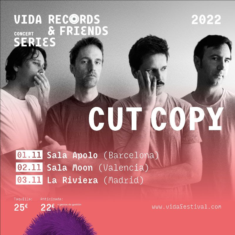 El cuarteto australiano de synthpop y pop electrónico Cut Copy actuarán en nuestro país en noviembre dentro de una gira mundial dividida en dos fases. Tras una primera tanda de conciertos por Norteamérica entre los meses de abril y mayo, la banda de Melbourne desembarcará en Europa en octubre para dar un total de nueve conciertos en el continente entre Irlanda, Inglaterra, Países Bajos, Francia, España y Portugal, con parada en Barcelona, Valencia y Madrid los días 1, 2 y 3 de noviembre. Tres fechas enmarcadas en el ciclo Vida, Records & Friends organizado por el mismo festival.