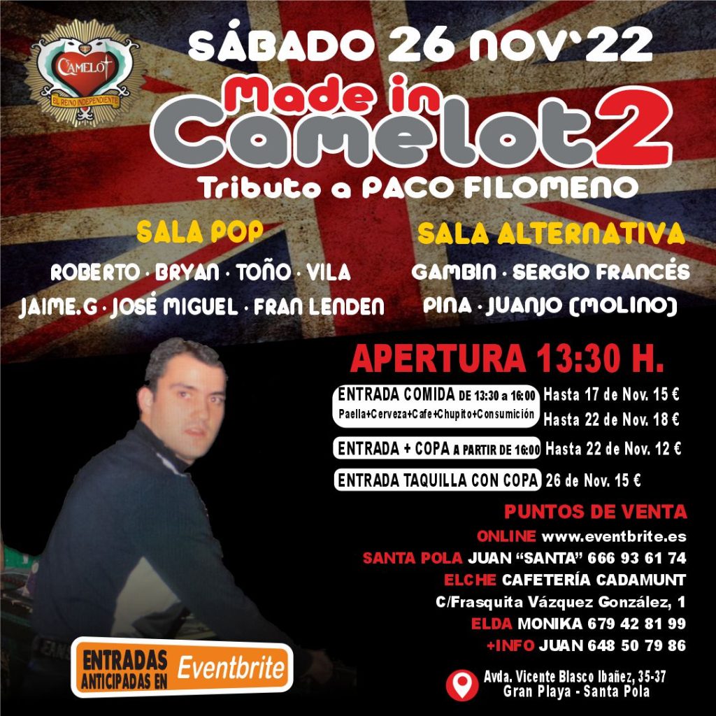 Y lo hará a través de la edición de un ‘Made in Camelot’ muy especial y emotivo en el que pincharán Roberto, Bryan, Toño, Vila, Jaime G, José Miguel y Fran Lenden en la Sala Pop. En la Alternativa serán Gambín, Sergio Francés, Pina y Juanjo (Molino) quienes ocupen su cabina desde las 13.30h y en adelante del próximo sábado, 26 de noviembre, en Club Camelot de la Gran Playa de Santa Pola.