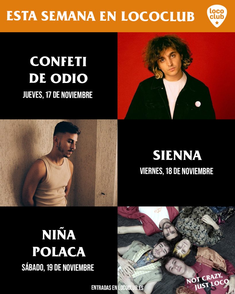 Loco Club presenta su programación para esta semana, el jueves reciben a Lucas Vidaur (Axolotes Mexicanos) con su proyecto en solitario Confeti de Odio; el viernes, Sienna nos introducirá en el universo de su «Melancolic» (2021), y el sábado contarán con la rabia y la energía del indie-rock de Niña Polaca. Cerrarán la semana con un mercadillo de ropa vintage, disco, artesanía… con djs y buena comida.