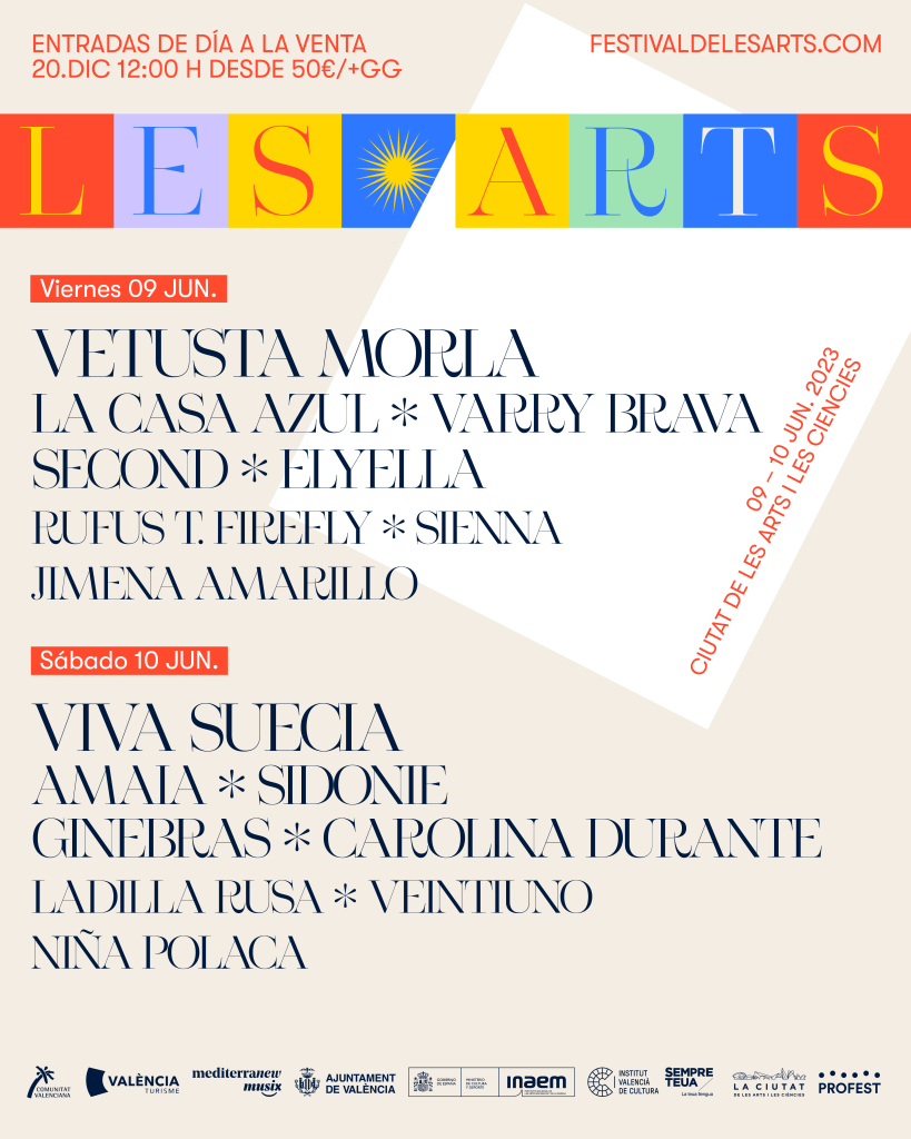 Nuevos artistas confirmados para el Festival de Les Arts 2023: Viva Suecia, La Casa Azul, ELYELLA, Varry Brava, Carolina Durante, Second, Veintiuno, Sienna y Niña Polaca se suman a un cartel que ya estaba formado por Vetusta Morla, Amaia, Sidonie, Rufus T.Firefly, Ladilla Rusa y Jimena Amarillo.