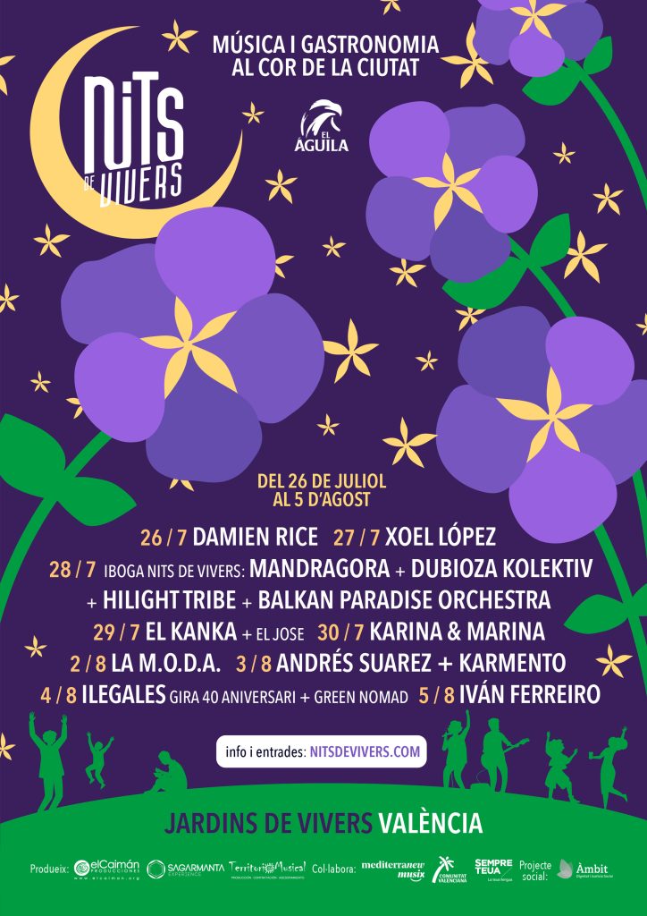 La tercera edición del ciclo de conciertos Nits de Vivers se celebrará entre el miércoles 26 de julio y el sábado 5 de agosto en los Jardines de Viveros de la ciudad de València. Una vez más, el festival acogerá algunos de los nombres más importantes de la escena musical. De esta manera, el cartel incluye la presencia de artistas internacionales como el cantautor Damien Rice, el productor y pinchadiscos Mandragora y las formaciones Dubioza Kolektiv y Hilight Tribe. Por otro lado, la programación se completa con intérpretes estatales como Andrés Suárez, El Kanka, Iván Ferreiro, Ilegales, La M.O.D.A., Karmento, Karina y Marina y la Balkan Paradise Orchestra. Las entradas están a la venta en la página web.