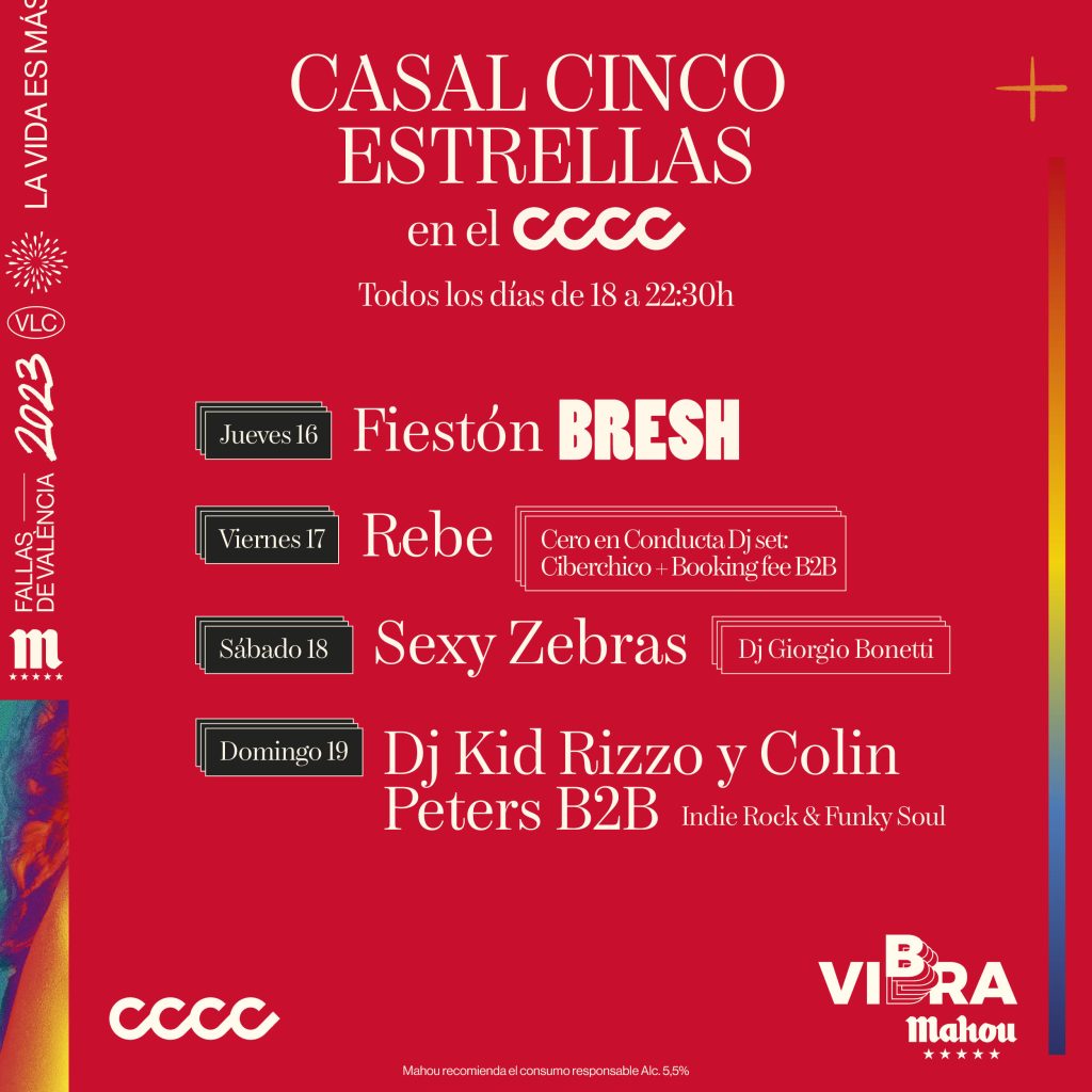 La marca cervecera ha programado la oferta musical y de ocio más joven y creativa de la ciudad en torno a las fiestas, con propuestas tan novedosas como la Bresh Party, que por primera vez llega a Valencia de la mano de Mahou. El Casal Cinco Estrellas contará además con los directos de Sexy Zebras y Rebe, y las sesiones de los dj’s Ciberchico, Booking Fee, Giorgio Bonetti, Kid Rizzo y Colin Peters, que completarán la programación.