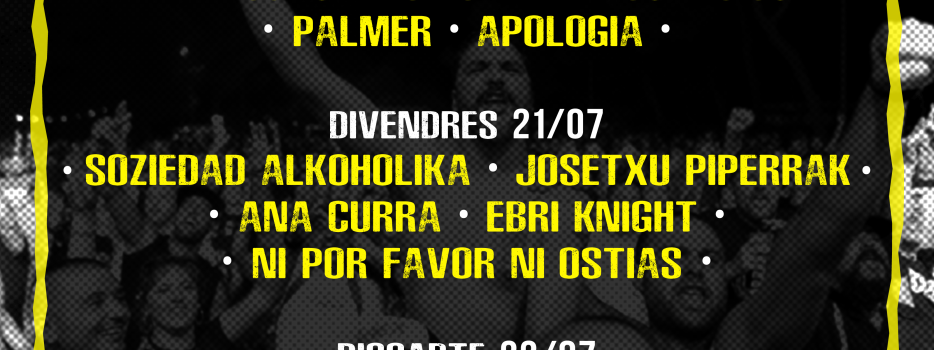 Así pues, una vez publicados los horarios por día, el cartel se distribuye de la siguiente manera: el jueves los primeros en dar la bienvenida a los y las asistentes serán Apología, a las 19.30 h. Después será el turno de Palmer, a las 20:30 h, seguidos de Malos Vicios a las 21:30 h. Por último, los dos últimos grupos serán El Drogas, dentro del cuarenta aniversario de Barricada, a las 22.30 y Boikot concluirá la noche a partir de las 00 h. Una vez finalice su concierto habrá DJ’s hasta las dos de la madrugada, cuando las puertas del pinar cerrarán hasta el día siguiente.