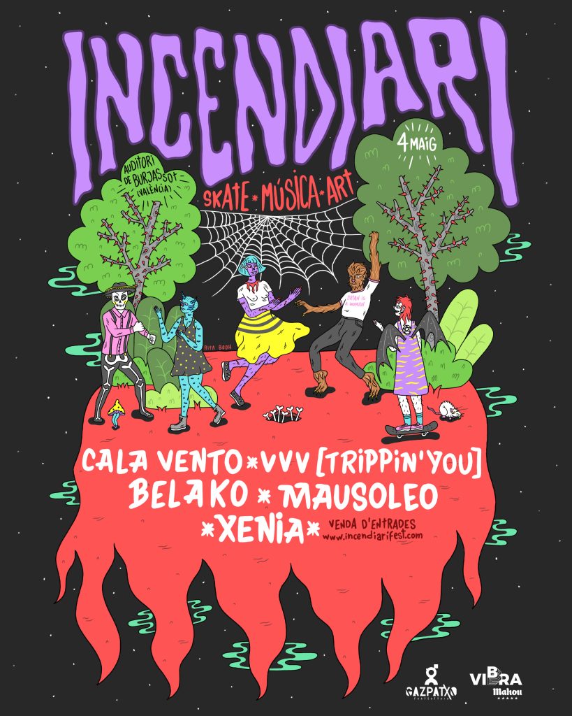 Este año, siguiendo con la apuesta que hace el festival por los artistas locales, incendiari ha contado con @ritaboooh para el diseño de la imagen del cartel. El carácter propio de la artista valenciana se integra a la perfección con la línea artística del evento, donde destaca los diferentes elementos que lo componen a través de bestias de la noche.