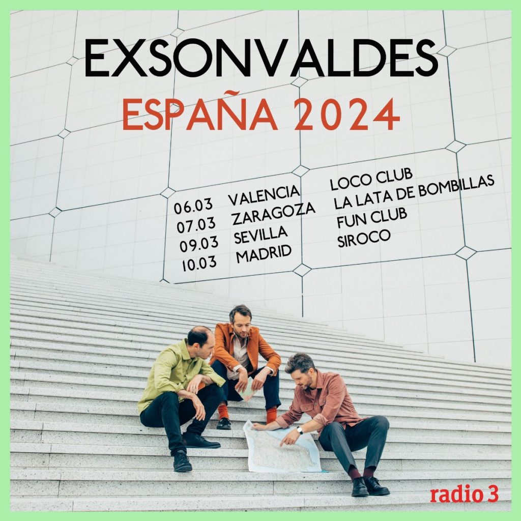 A pocos días de visitar España, el grupo parisino Exsonvaldes presenta un nuevo single, «Countdown», una nueva pieza de orfebrería pop que sumar al impecable repertorio de su último y recién publicado álbum, «Maps». Un disco que llegaba siete años después de “Aranda”. Vuelven y regresan también sus conciertos. Exsonvaldes estarán actuando en España este mes de marzo. Arrancará la gira en el Loco Club de Valencia el 6 de marzo, al día siguiente, 7 de marzo, estarán en La Lata de Bombillas en Zaragoza, de ahí viajarán a Sevilla donde actuarán el 9 de marzo en Fun Club, para terminar esta primera parte de la gira en Madrid, el 10 de marzo en Siroco Club.