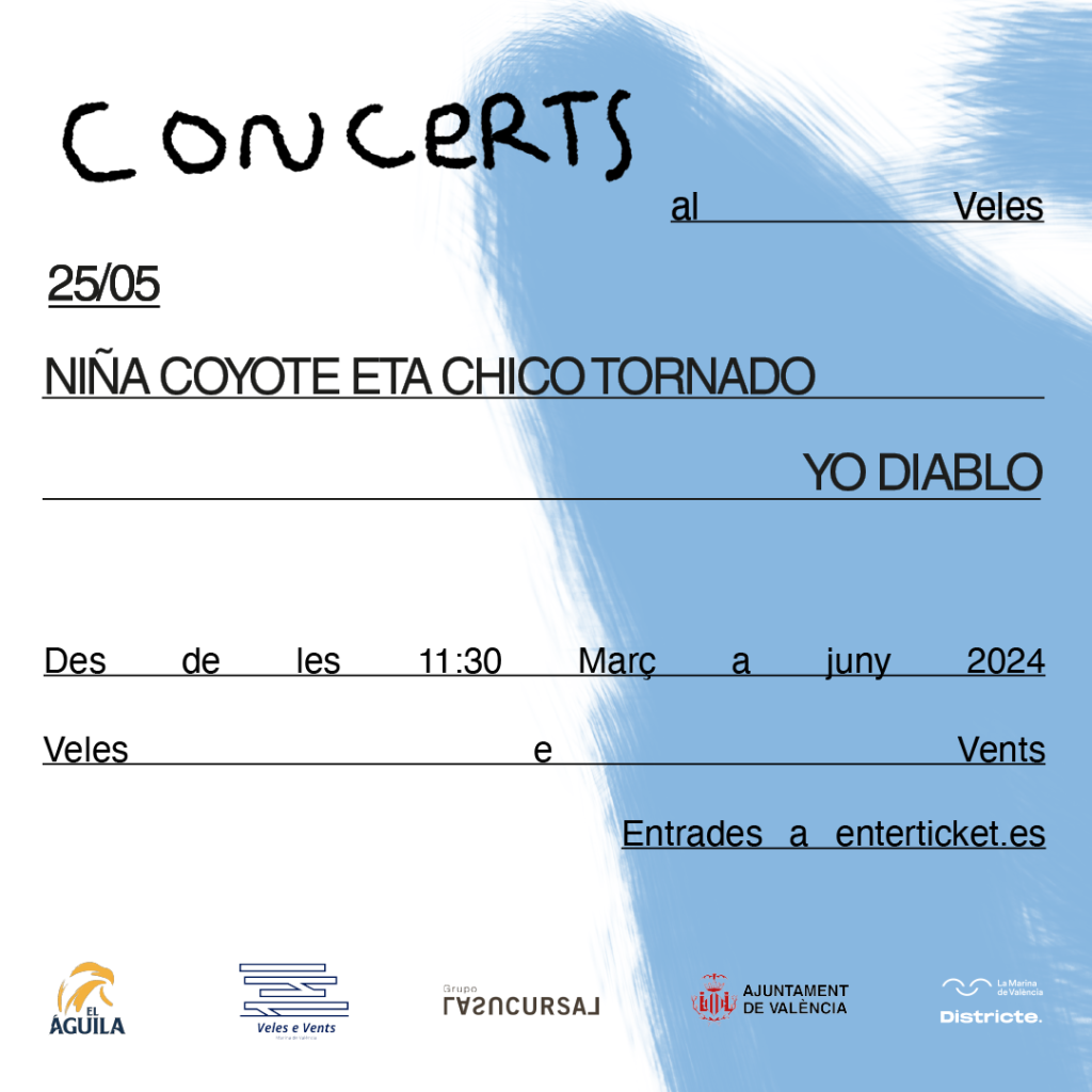El ciclo de conciertos Concerts al Veles llega a las últimas fechas de esta temporada. Este sábado contará con los conciertos de Niña Coyote eta Chico Tornado y Yo Diablo. Un matinal de rock, una fiesta, homenaje a la sala 16 Toneladas, una de las salas de conciertos más activas y emblemáticas de la ciudad.