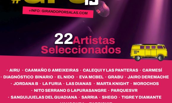 Un total de 22 grupos y solistas, de variados estilos (pop, folk, rock, hip-hop, músicas del mundo, jazz, electrónica, música de raíz, flamenco-fusión, reggae, canción de autor…), son los seleccionados para la edición #GPS15 de Girando Por Salas, iniciativa del Instituto Nacional de las Artes Escénicas y de la Música (INAEM) del Ministerio de Cultura, siendo entidad colaboradora la Federación Coordinadora del Circuito de Músicas Populares (FCMP), formada por las siguientes asociaciones profesionales: ACCES (Asociación Estatal de Salas de Música en Directo), APM (Asociación de Promotores Musicales), ARC (Associació de Representants, Promotors i Managers de Catalunya), ARTE (Asociación de Representantes Técnicos del Espectáculo), MUSICAT (Associació Professional de Músics de Catalunya), PROMUSICAE (Productores de Música de España) y UFI (Unión Fonográfica Independiente).