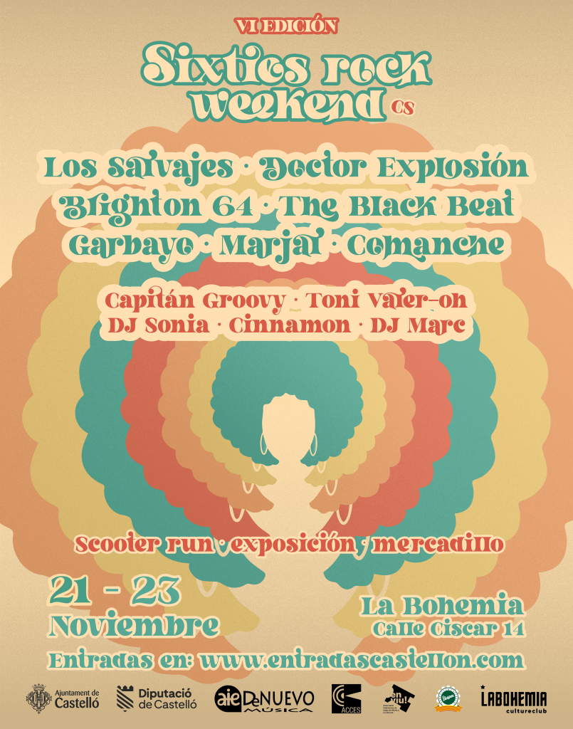 El Festival Sixties Rock Weekend recupera su sexta edición después de once años en pausa este viernes y sábado. El evento trae a Castellón lo más destacado de la música y de la cultura de los años sesenta, tanto del panorama nacional como internacional. Además, el jueves tendrá lugar una PreParty con motivo del Dia de la Música, programa que forma parte del INAEM en colaboración con ACCES, con entrada gratuita a partir de las 20.00 h donde tocará Comanche y los DJ’s Marc Ripollés y Toni Valer-Oh.