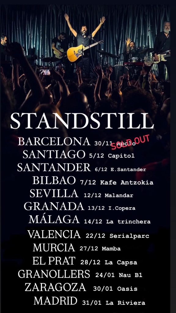 El retorno de Standstill ha sido uno de los acontecimientos del año. Como pueden atestiguar quienes les han visto este verano en festivales como Tomavistas, PortAmérica, Vida, Sonorama, Canela Party o Vive Latino, su directo sigue siendo una experiencia al alcance de muy pocos. Una catarsis plena de emoción y belleza que, madurada en casi una década de silencio regresa más intensa que nunca a su hábitat natural: las salas. Una gira que arrancará el próximo 30 de noviembre con sold-out en Apolo (Barcelona), el escenario donde se despidieron en octubre 2015 con dos actuaciones inmortalizadas en el CD-DVD Estaría muy bien (2016), y se prolongará hasta final de enero con una larga docena de conciertos repartidos por toda la península.