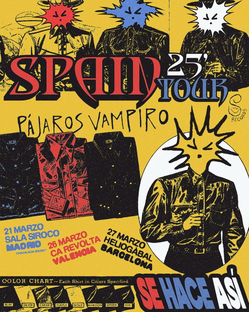Pájaros Vampiro, originarios de la Ciudad de México, han emergido como una propuesta fresca en el indie nacional. Con una energía cruda y sin filtros, la banda se ha convertido en un himno para los que viven al filo de la nostalgia y la rebeldía. En esta gira, presentan su esperado álbum Se Hace Así, un disco que no embellece las cicatrices, sino que las muestra con orgullo. Producido por Toño Montes (Los Románticos de Zacatecas) y con una identidad visual a cargo de Cole Becker (SWMRS), este álbum es un manifiesto de lo que significa estar vivo en un mundo que parece derrumbarse. A lo largo de su carrera, la banda ha compartido escenario con The Drums, Carolina Durante, Mujeres, Boom Boom Kid, Triángulo de Amor Bizarro y hasta hace no mucho nos mostraban su madurez impotente con su sencillo Sólo Somos Números. El pasado fin de semana, lograron un rotundo éxito con un sold out en la sala Siroco de Madrid.