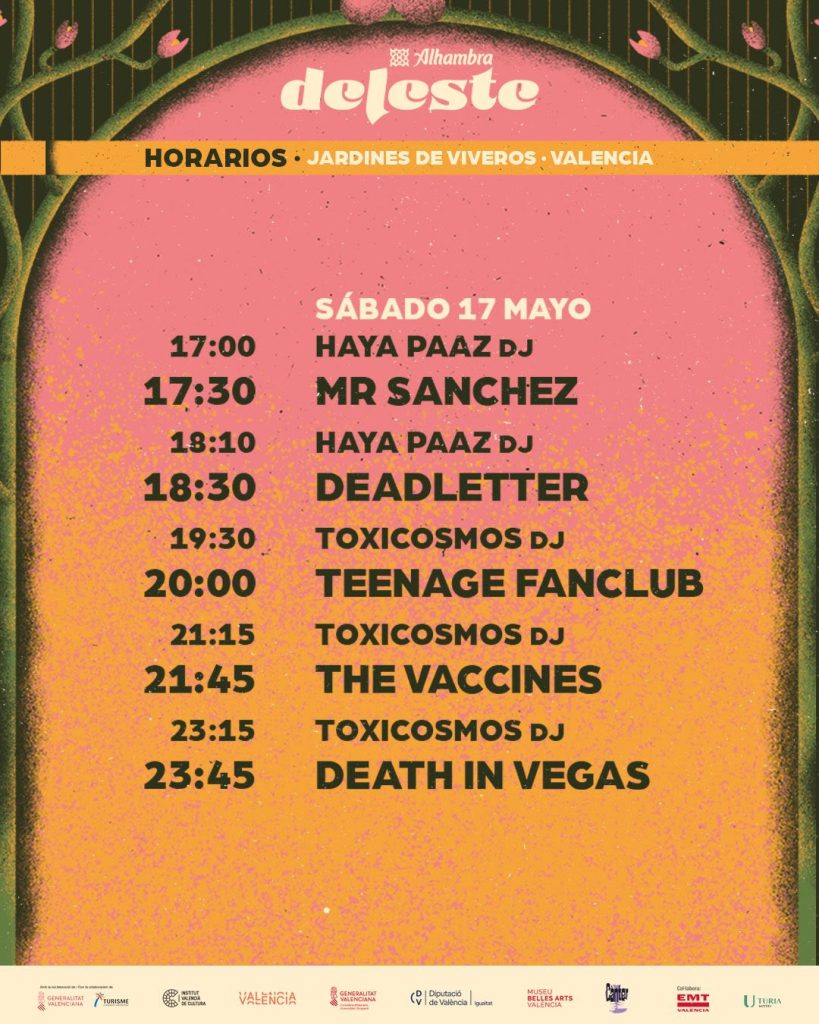 Atención a la segunda jornada del sábado 17 de mayo, pues se vienen curvas. Antes de que Haya Paaz nos dé el subidón con sus hits, como solo lo hace un buen cremaet, el Museo de Bellas Artes de València vivirá a las 12:00 un aperitivo musical de primer nivel con el acústico de Ana Zomeño, cantautora de sensibilidad exquisita y una de las voces más prometedoras de la escena valenciana. Un concierto íntimo, gratuito y abierto hasta completar aforo, que dará la bienvenida a una jornada cargada de emoción que seguirá con las actuaciones de The Vaccines y sus himnos que definieron toda una era, los veteranos e ilustres Teenage Fanclub, todo unos popes de la electrónica como Death In Vegas, el afilado sonido post-punk de Deadletter, el poderoso rock guitarrero de Mr Sanchez, y el dj Toxicosmos, responsable de que nadie deje de quemar zapatilla entre actuación y actuación.