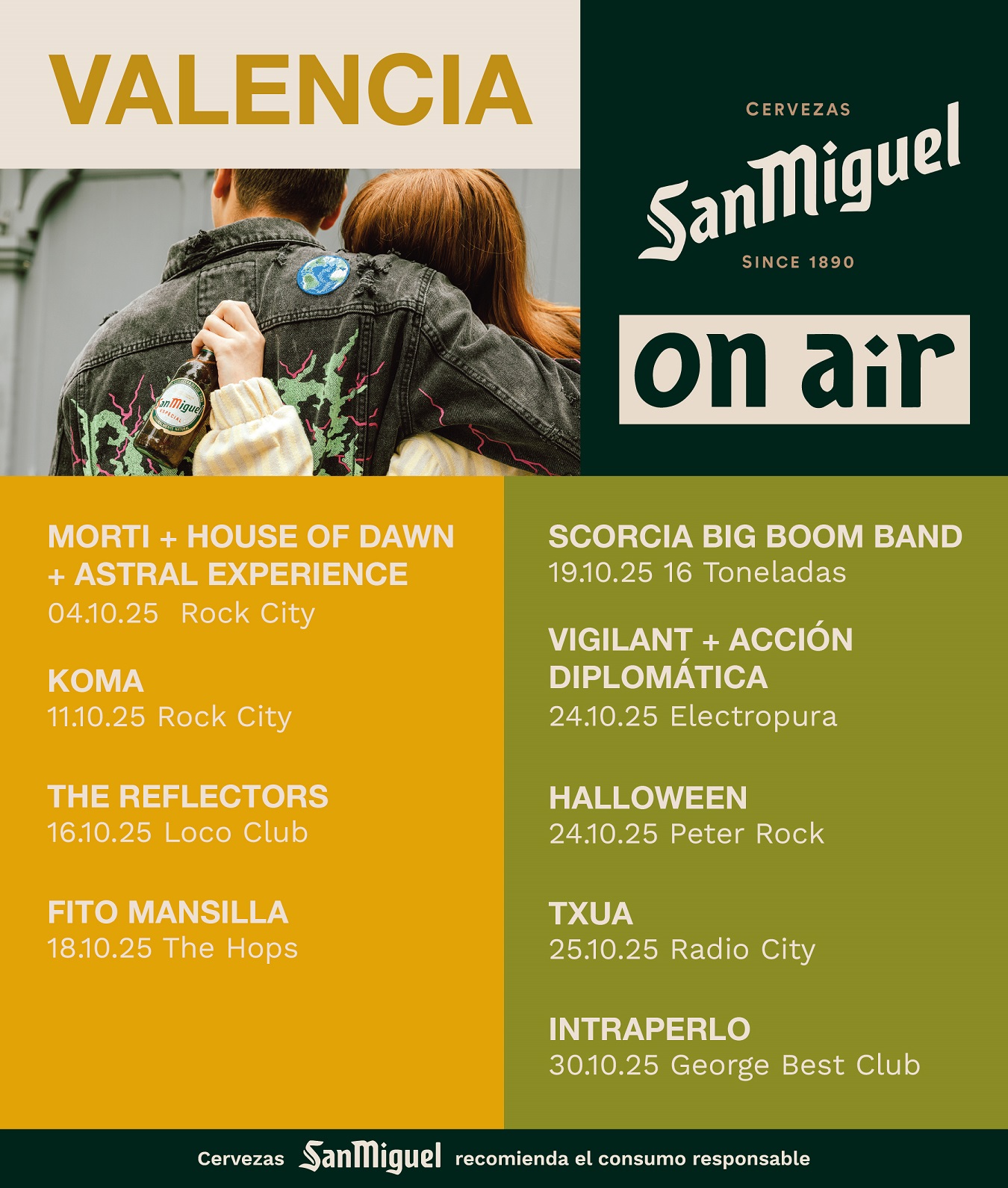 El ciclo arranca en octubre con una agenda de directos que abarca distintos géneros y escenarios míticos de la ciudad. El pistoletazo de salida será el sábado 4 de octubre en Rock City con Morti, House of Dawn y Astral Experience; le seguirán Koma (11 de octubre, Rock City), The Reflectors (16 de octubre, Loco Club), Fito Mansilla (18 de octubre, The Hops), Scorcia Big Boom Band (19 de octubre, 16 Toneladas) y las dobles propuestas de Vigilant + Acción Diplomática (24 de octubre, Electropura) y Halloween (tributo a Helloween) (24 de octubre, Peter Rock). La programación de octubre continuará con Txua (25 de octubre, Radio City) y se cerrará con Intraperlo (30 de octubre, George Best Club).