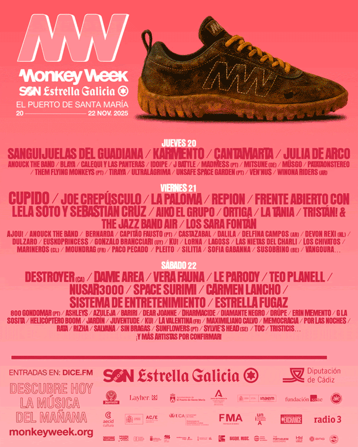 Y es que este Monkey Week SON Estrella Galicia, no nos cansamos de repetirlo, tiene mucho que contar, y que cortar. Y eso que, ojo, aun quedan más noticias por desvelar y más nombres por sumarse a una 17ª edición que celebrará por todo lo alto el regreso del festival a casa: El Puerto de Santa María. O la Ciudad de la Música, como muchos ya le llamamos, y que abrirá sus puertas para todos los melómanos del 20 al 22 de noviembre.