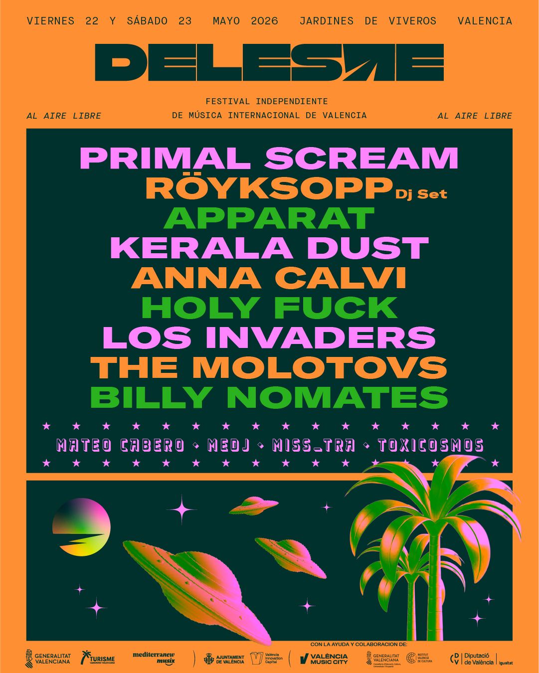Desde Deleste anuncian una nueva ronda de confirmaciones para la 14ª edición, que se celebrará los días 22 y 23 de mayo en València, con los Jardines de Viveros como escenario principal. A los artistas ya presentados (Primal Scream, Apparat, Kerala Dust, Holy Fuck, Los Invaders y Billy Nomates) se suman ahora los noruegos Röyksopp con un DJ set especial, junto a los británicos Anna Calvi y The Molotovs. Además, el cartel se completa con los DJs Mateo Cabero, ME dj, Miss_Tra y Toxicosmos, que pondrán banda sonora a cada jornada antes, entre y después de los conciertos para que la experiencia Deleste se viva sin interrupciones.