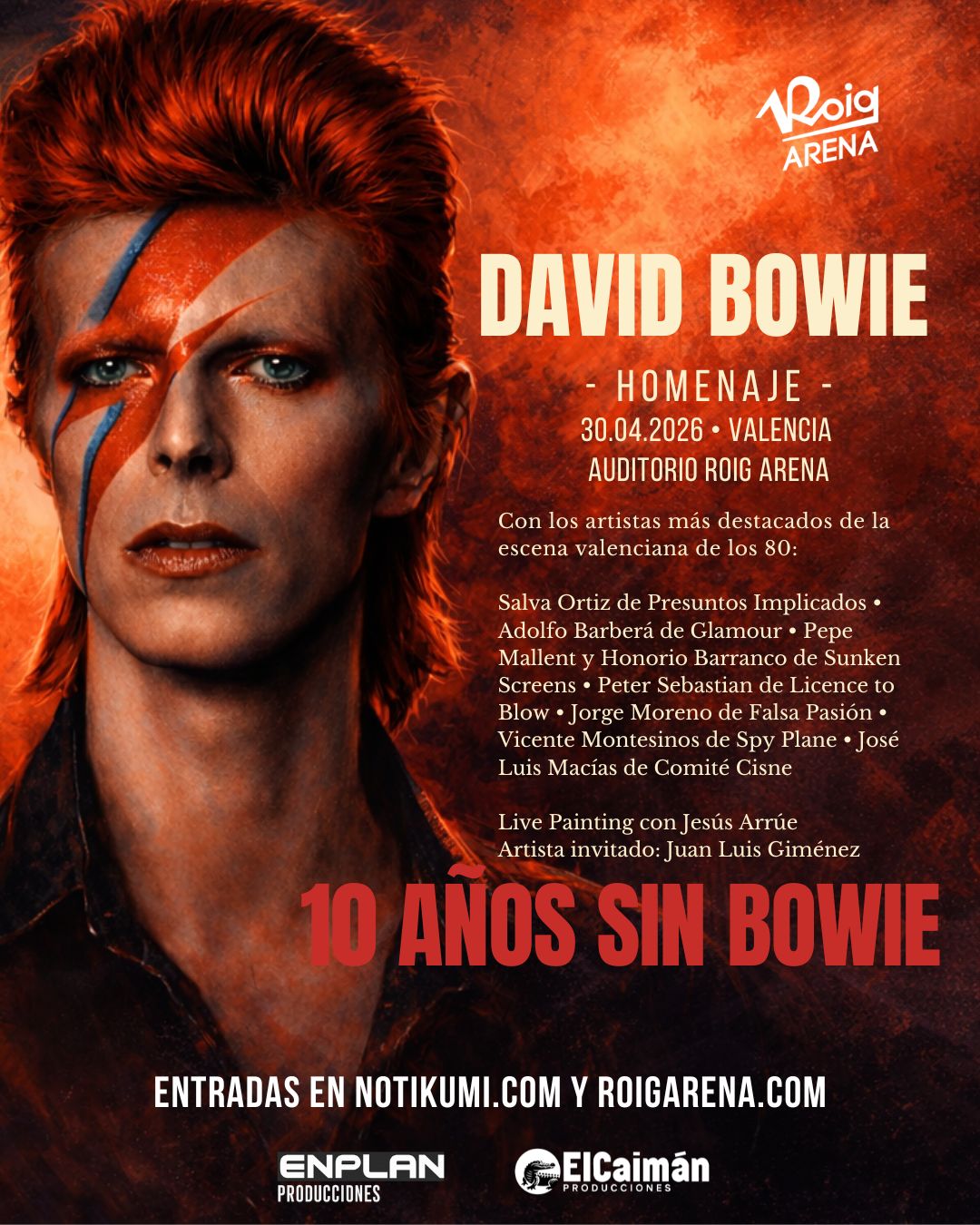 El Auditorio Roig Arena se prepara para acoger este jueves 30 de abril el homenaje a David Bowie,10 años sin Bowie, una propuesta concebida como un encuentro excepcional entre músicos valencianos que han marcado distintas etapas del pop y el rock en la ciudad.